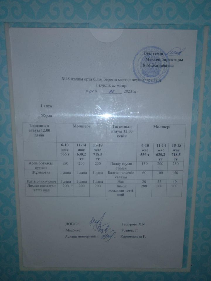 12 декабрь 2023 0 1 2 3 4 5 № 48 ЖАЛПЫ ОРТА БІЛІМ БЕРЕТІН МЕКТЕБІ Шымкент қалалық білім басқармасына қарасты №48 жалпы орта білім беретін мектебінің 01- желтоқсан күнгі ас мәзірі.